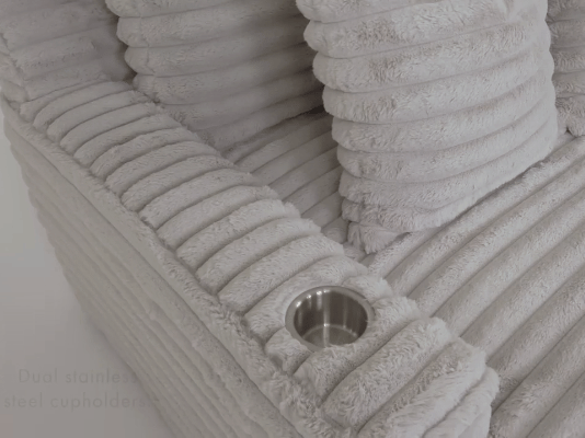 Our chaise lounge is the perfect addition to your living room for ultimate relaxation. Its ultra-dense, soft luxurious feel is made with wide, super soft corduroy fabric that is both durable and stylish. The chaise lounge has a lofty appearance and is accompanied by three back pillows and two down filled toss pillows for added comfort. With two USB ports, you can conveniently charge your electronic devices while lounging. And with two cupholders, you can easily enjoy your favorite beverage without having to get up. Whether you are watching a movie or reading a book, our Chaise Lounge is the perfect spot to unwind and relax.